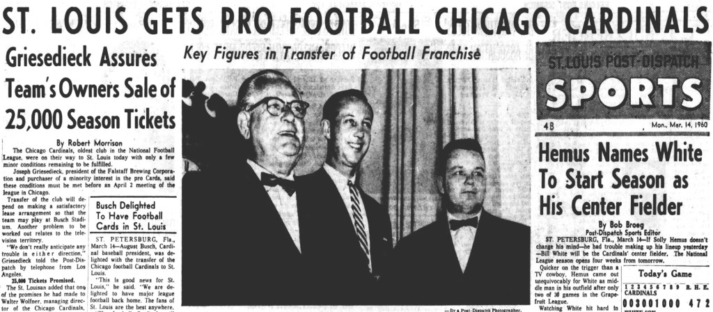 Approval of the move was provisional based on Wolfner’s ability to arrange a suitable lease for Busch Stadium and work out satisfactory arrangements for telecasting rights. Commissioner Rozelle gave an April 2 deadline for the transfer of the team to become effective. Both conditions were resolved prior to the deadline.