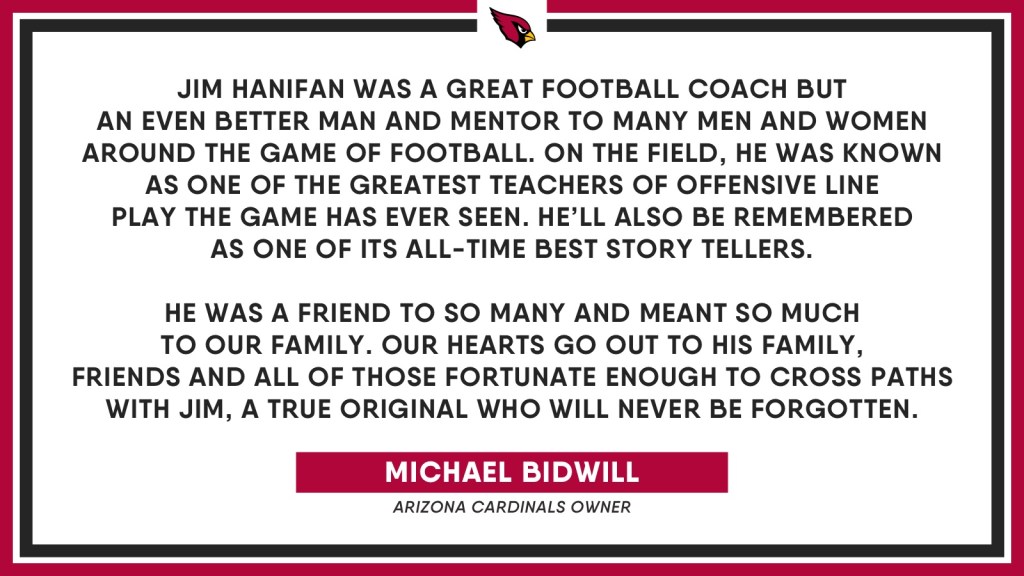 Hanifan was the offensive line coach for the Football Cardinals from 1973-1978 and then head coach from 1980-1985. He later won Super Bowl rings while coaching with Washington and the St. Louis Rams. Many younger St. Louis NFL fans will remember Hanifan in the Rams radio booth from 2004-2008.