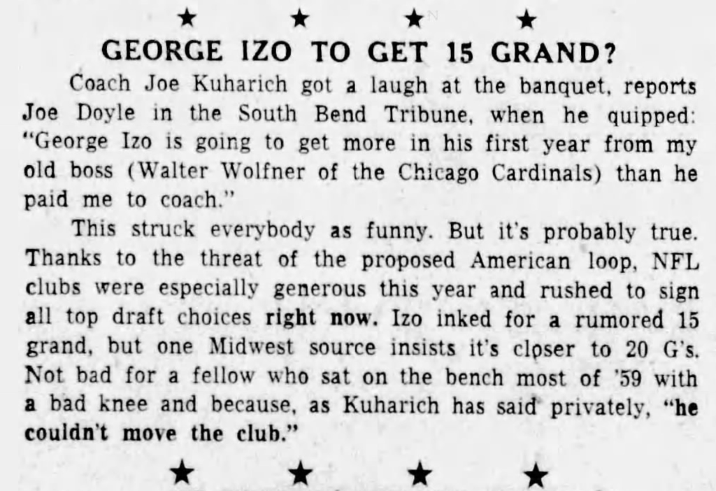 *Izo played only one season, 1960, for the Cardinals and started only one game. Izo’s 1960 stats: 24 pass attempts, 10 completions, 115 yards, 0 touchdowns, 0 interceptions. He played six more seasons in the NFL—four for Washington, one for Detroit and one for Pittsburgh—mostly as a backup. George Izo Sr., his father, played quarterback at Notre Dame under legendary coach Knute Rockne.
