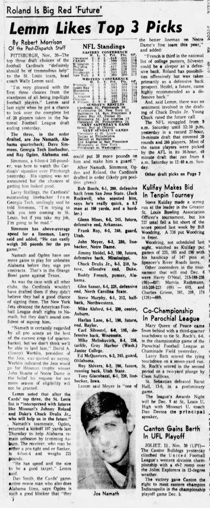 The Big Red made a play for Joe Namath, taking the Alabama quarterback with their first-round pick (12th overall), but lost him in a bidding war with the New York Jets, who made him the first overall pick in the AFL Draft. The Cardinals dispatched two representatives to Tuscaloosa, AL to meet with Namath in his dorm room and try to sign him to a contract. Namath told them he wanted a $200,000 annual contract and a Lincoln Continental convertible.