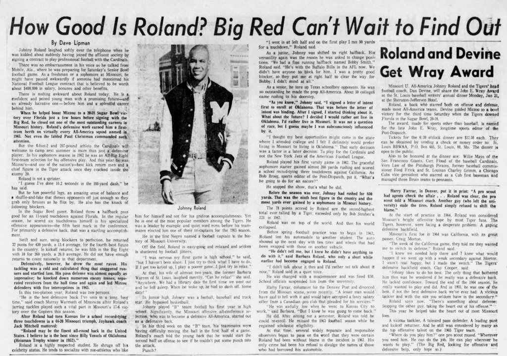 *Johnny Roland played his final season of eligibility at Missouri in 1965, then joined the Cardinals in ’66. He made an immediate impact: 695 yards and five touchdowns rushing, 213 yards receiving, a league-leading 11.1-yard average and one TD on 20 punt returns, and a 23.1-yard average on 15 kick returns. Both the Associated Press and United Press International named Roland the league’s Rookie of the Year. He was selected to the Pro Bowl, an honor he would earn again in 1967.