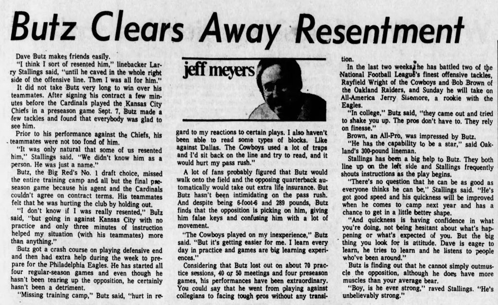 *The 6-7, 291-pound Butz played in 12 games (10 starts) as a rookie and was credited with five sacks and one fumble recovery. In 1974, he played one game and suffered a season-ending knee injury. A salary dispute brought his stay in St. Louis to a quick end after the ’74 season. “He asked for a guaranteed, no-cut contract and he asked for multi-contracts,” Cardinals Director of Operations Joe Sullivan said. “The things he was asking for make people fat, dumb and happy.” Because of a technicality in his contract, Butz was granted free agency. He signed with George Allen’s Washington Redskins and played 14 more seasons, earning first-team All-Pro honors in 1983. He played on two Super Bowl champions in Washington and was named to the NFL 1980s All-Decade team.