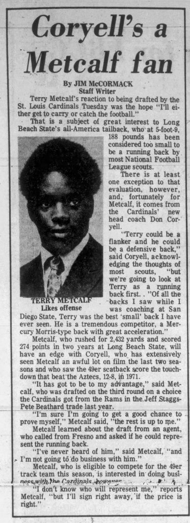 After his first draft as head coach of the Cardinals, Don Coryell gave his stamp of approval to the team’s first four picks: Purdue defensive tackle Dave Butz, Texas-El Paso quarterback-punter Gary Keithley, Bowling Green guard Fred Sturt, and Long Beach State running back Terry Metcalf.
