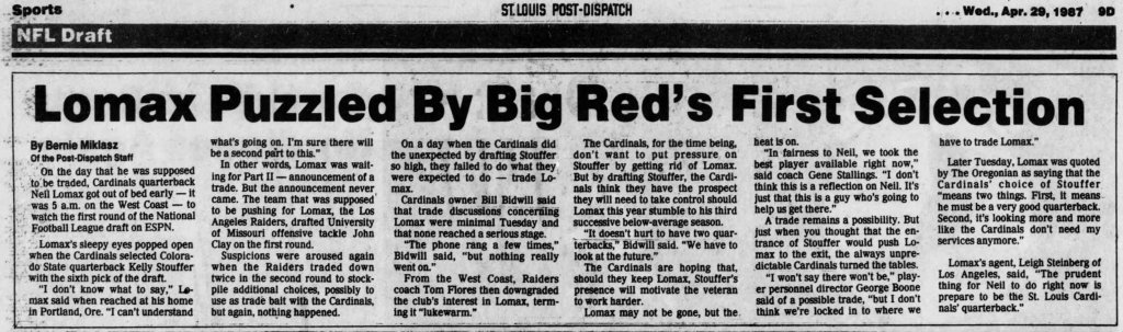 There was some suspicion that one of the reasons the Big Red drafted Stouffer was to put some pressure on incumbent quarterback Neil Lomax, who may have been the subject of behind-the-scenes trade talk.