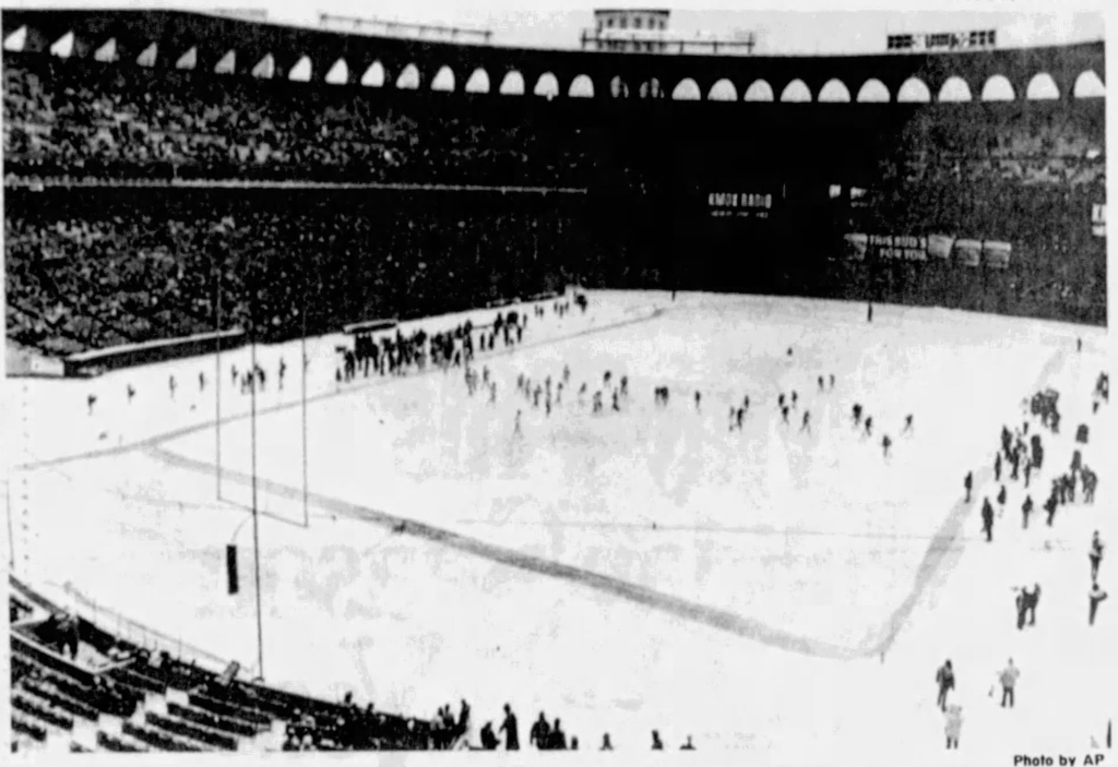 With fans chanting and teammates waving him into the game, Dierdorf briefly conferred with head coach Jim Hanifan and then finally tore off his stocking hat and parka, put on his helmet, and ran onto the snow-covered Busch Stadium turf.