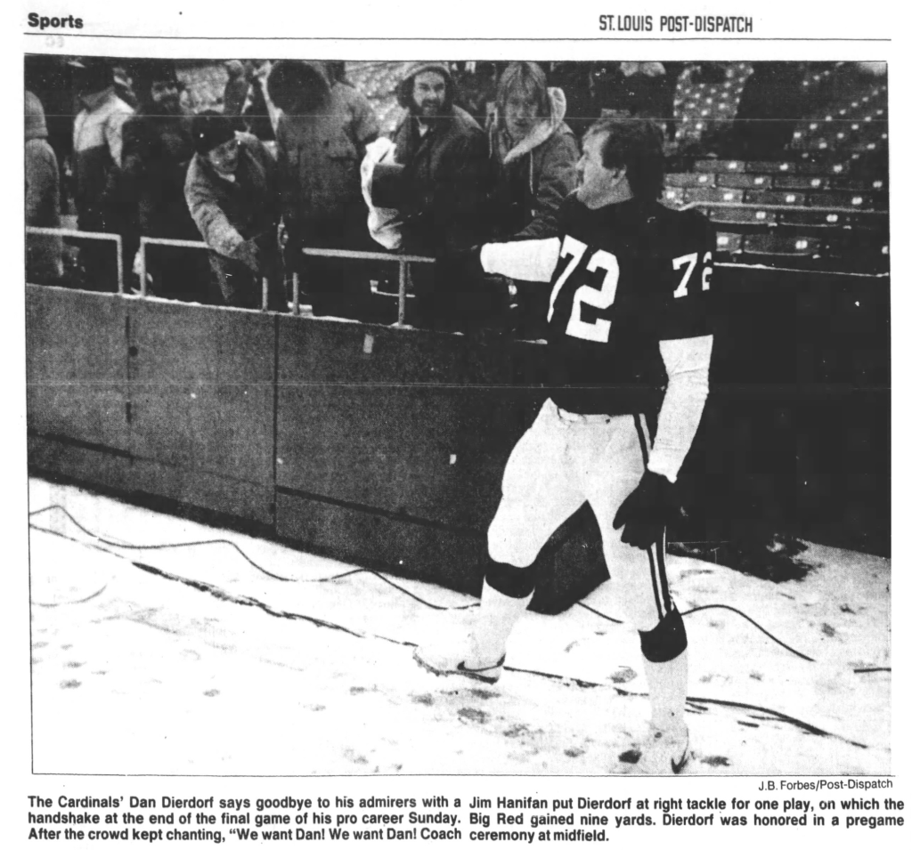 Dan Dierdorf, who played for the St. Louis Cardinals for 13 seasons (1971-1983), had announced at midseason that he would retire at the end of the 1983 campaign. The former second-round draft choice out of Michigan had planned to take a few snaps at his old right tackle position during the season finale against the Philadelphia Eagles, but the weather almost changed his mind.