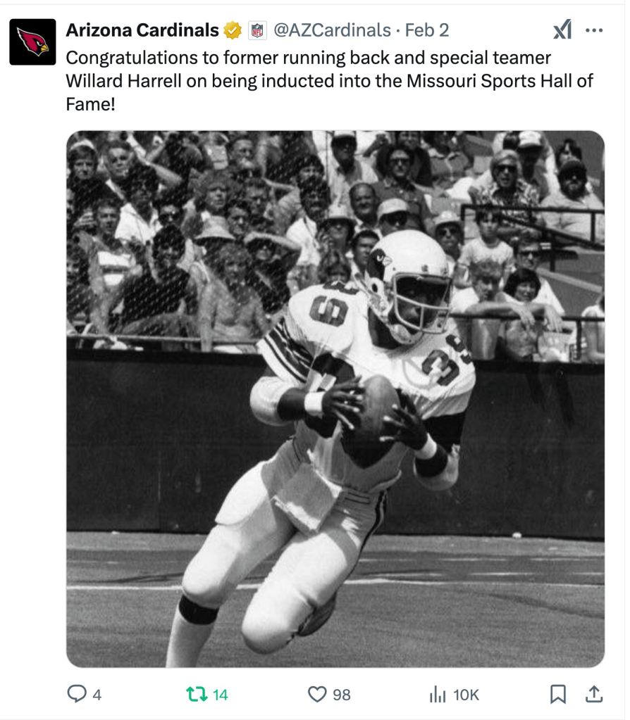 “A few days later (after the tryout), they contacted my agent with an offer and I became a Cardinal,” Harrell said. “I found out later that Hanifan (former St. Louis head coach Jim Hanifan) was responsible for me becoming a Cardinal. He remembered me from my college days and always wanted me to play for him.”