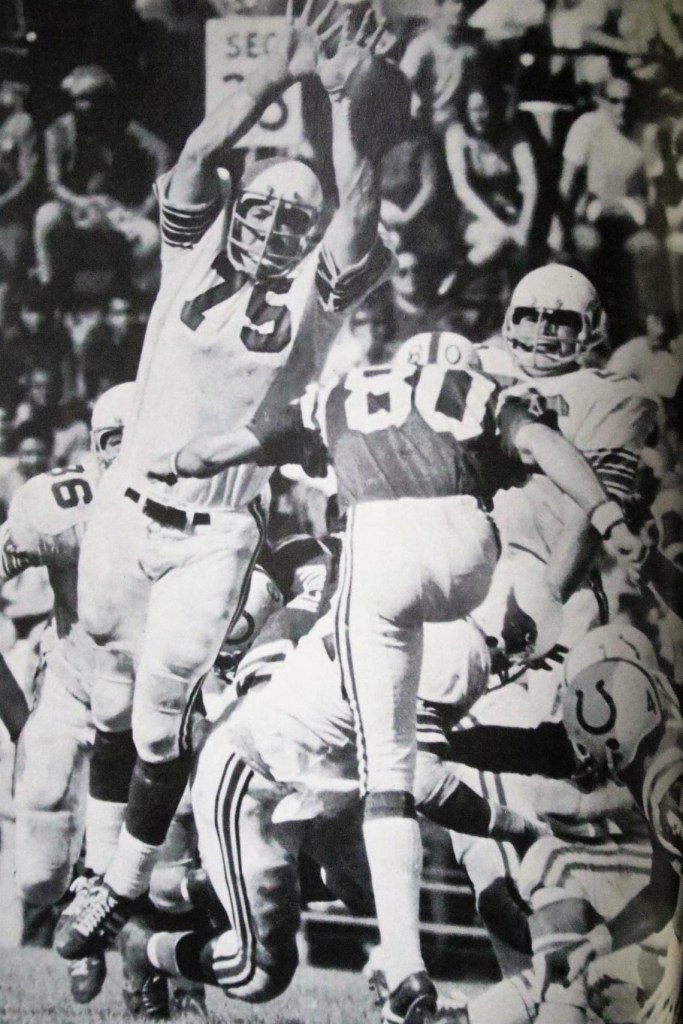 Bob Rowe with one of his three blocked kicks against the Colts in 1972.